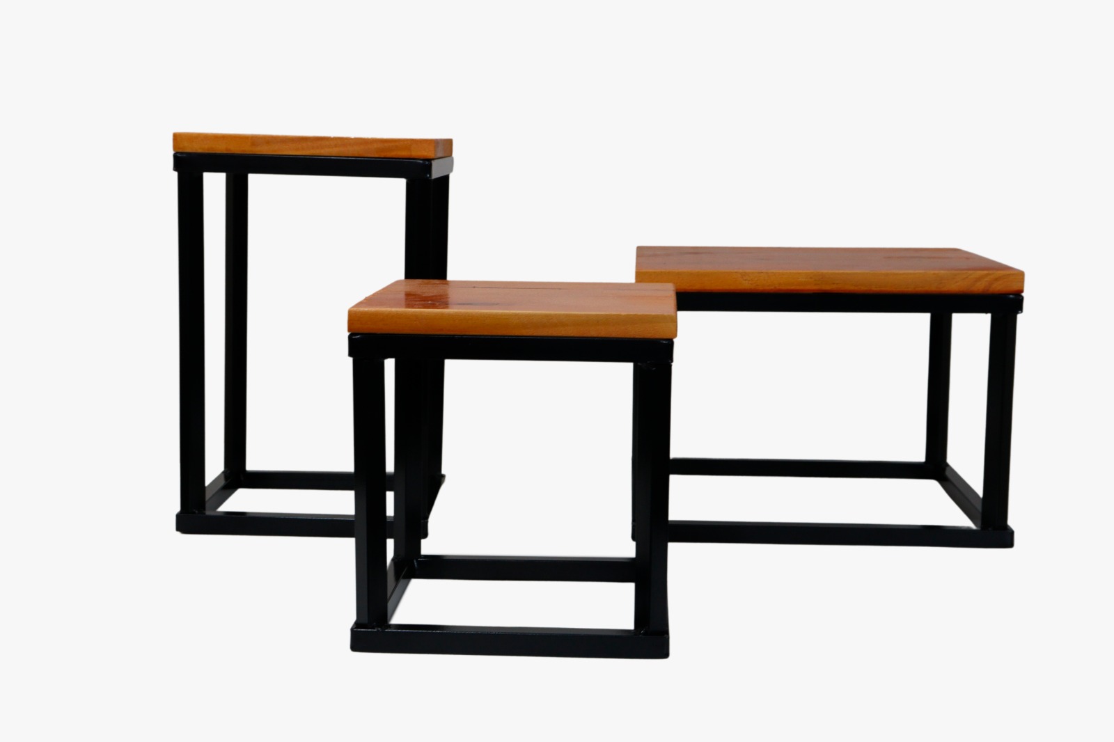 Kit de 3 mesinhas para decoração e Suporte para docinhos de festa, feitas em ferro, com tampo de madeira.